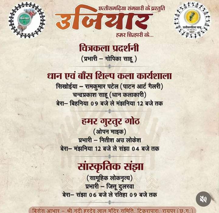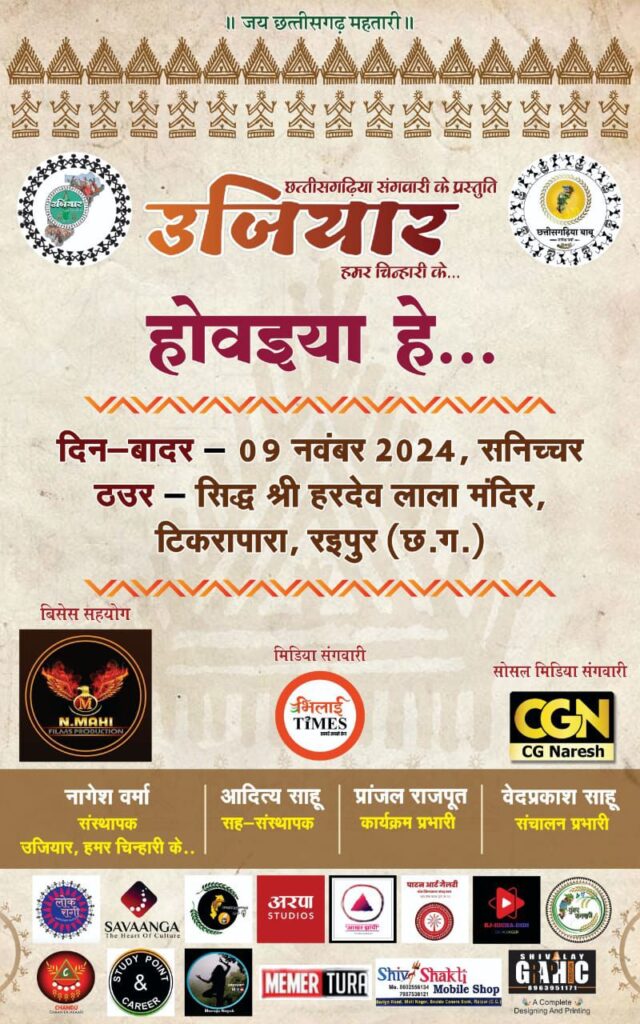 छत्तीसगढ़ी भाखा और संस्कृति को संजोय के उद्देश्य से युवाओं की पहल उजियार हमर चिन्हारी का आयोजन 9 नवंबर दिन शनिवार सुबह 9:00 बजे से रात्रि 9:00 बजे तक स्थान सिद्ध हरदेवलाल मंदिर टिकरापारा रायपुर में संपन्न होगा जिसमें छत्तीसगढ़ी के लोक संस्कृति उजियार संस्था द्वारा युवा पीढ़ी को छत्तीसगढ़ के संस्कृति से जोड़ने का काम किया जा रहा है जिसके तहत छत्तीसगढ़ की सभी संस्कृति को उजियार के माध्यम से प्रस्तुत करेंगे इस वर्ष नए कांसेप्ट के साथ उजियार कार्यक्रम के संस्था के युवा तैयारी में लगे हैं
