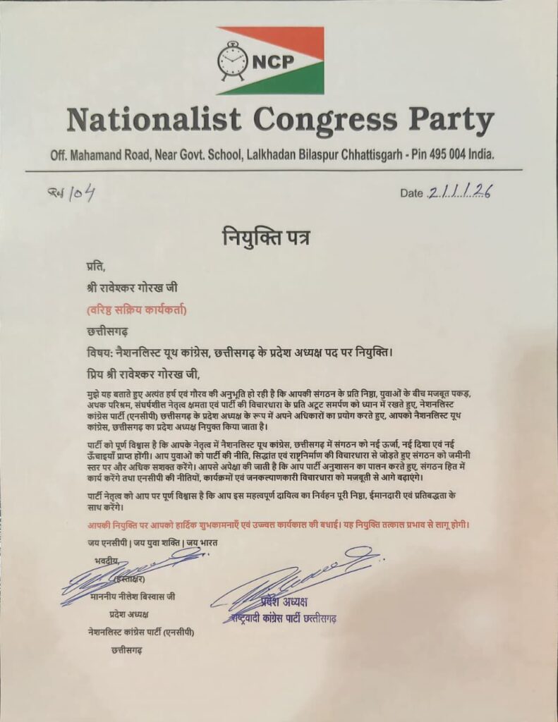 बिलासपुर में आज नेशनलिस्ट यूथ कांग्रेस छत्तीसगढ़ में संगठनात्मक विस्तार के तहत वरिष्ठ सक्रिय कार्यकर्ता रावेश्कर गोरख को प्रदेश अध्यक्ष नियुक्त किया गया है। पार्टी द्वारा जारी नियुक्ति पत्र के अनुसार यह निर्णय तत्काल प्रभाव से लागू किया गया है, जिसे संगठन के लिए एक अहम कदम माना जा रहा है।इसी के साथ बिलासपुर में पदाधिकारी नियुक्त करने के दाँत साथ कोरबा में भी सक्रिय जिम्मेदारों की नियुक्तियां की गई है।पार्टी सूत्रों के अनुसार रावेश्कर गोरख की नियुक्ति उनकी संगठन के प्रति निष्ठा,जमीनी स्तर पर सक्रियता,युवाओं के बीच मजबूत पकड़ और पार्टी की विचारधारा के प्रति समर्पण को देखते हुए की गई है।एनसीपी नेतृत्व को विश्वास है कि उनके नेतृत्व में संगठन को नई दिशा और मजबूती मिलेगी।एनसीपी छत्तीसगढ़ प्रदेश अध्यक्ष नीलेश विश्वास ने नियुक्ति पर प्रसन्नता जताते हुए कहा कि रावेश्कर गोरख के नेतृत्व में संगठन ब्लॉक, जिला और विधानसभा स्तर पर और अधिक सशक्त होगा। उन्होंने कहा कि पार्टी की विचारधारा को जन-जन तक पहुंचाने के लिए निरंतर कार्यक्रम आयोजित किए जाएंगे।प्रदेश अध्यक्ष ने यह भी कहा कि 2026 को ध्यान में रखते हुए संगठनात्मक गतिविधियों को तेज किया जाएगा और पवार साहब की विचारधारा व सिद्धांतों को आम जनता तक पहुंचाने का कार्य किया जाएगा। एनसीपी ने जनता और कार्यकर्ताओं से सहयोग की अपील करते हुए भरोसा जताया कि छत्तीसगढ़ में पार्टी लगातार मजबूत होती जाएगी।वहीं नई जिम्मेदारी पाकर रावेश्कर गोरख ने कहा कि पार्टी के विस्तार के लिए जनता के हित के लिए वे हमेशा अग्रसर रहेंगे।