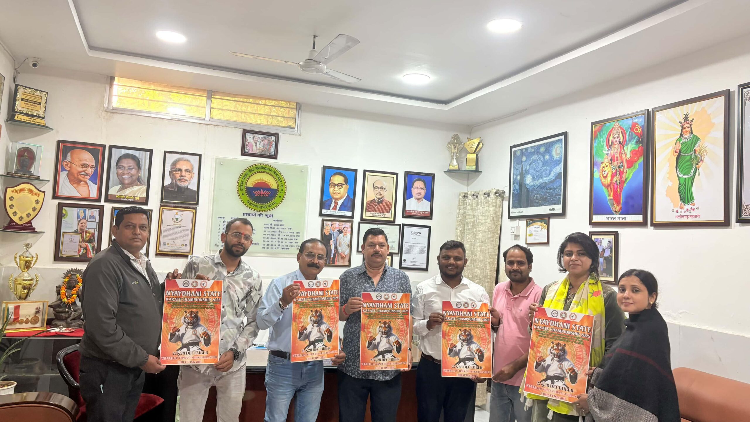 न्यायधानी स्टेट कराते चैंपियनशिप 2025 जो कि 27 व 28 दिसंबर को डी.पी. विप्र महाविद्यालय बिलासपुर में आयोजित होना है । प्रतियोगिता के पोस्टर का अनावरण डी.पी. विप्रा महाविद्यालय के प्राचार्या श्रीमती अंजू शुक्ला के मार्गदर्शन पर श्री एम एस तांबोली सर डॉ अजय यादव सर डॉ निधीश चौबे सर डॉ श्री राम सर डॉ आशीष शर्मा श्रीमती सृष्टि कांस्नर मैडम राज वर्मा जी अरुण नथनी जी संजुक्ता दास जी के कर कमलों द्वारा किया गया। कराते एसोसिएशन ऑफ छत्तीसगढ़ के अध्यक्ष श्री सुशील चंद्रा जी व महासचिव श्री अविनाश सेठी जी ने बताया कि इस प्रतियोगिता में पूरे प्रदेश भर के अनेक जिलो से खिलाड़ी हिस्सा लेने न्यायधानी बिलासपुर के पधार रहे है। जिसकी तैयारी में पूरे जिले के अधिकारी पदाधिकारी सदस्य पूरे तन मन से अपना सहयोग प्रदान कर रहे है। इस प्रतियोगिता की जानकारी कराते एसोसिएशन ऑफ़ बिलासपुर के महासचिव प्रतीक सोनी जी ने दी।
