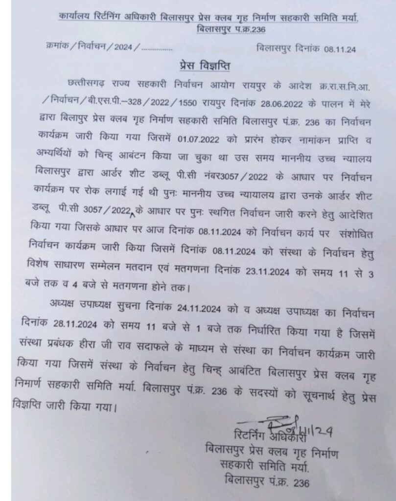 बिलासपुर प्रेस क्लब गृह निर्माण सहकारी समिति के पूर्व अध्यक्ष के खिलाफ एफआईआर दर्ज कराने पेश याचिका खारिज