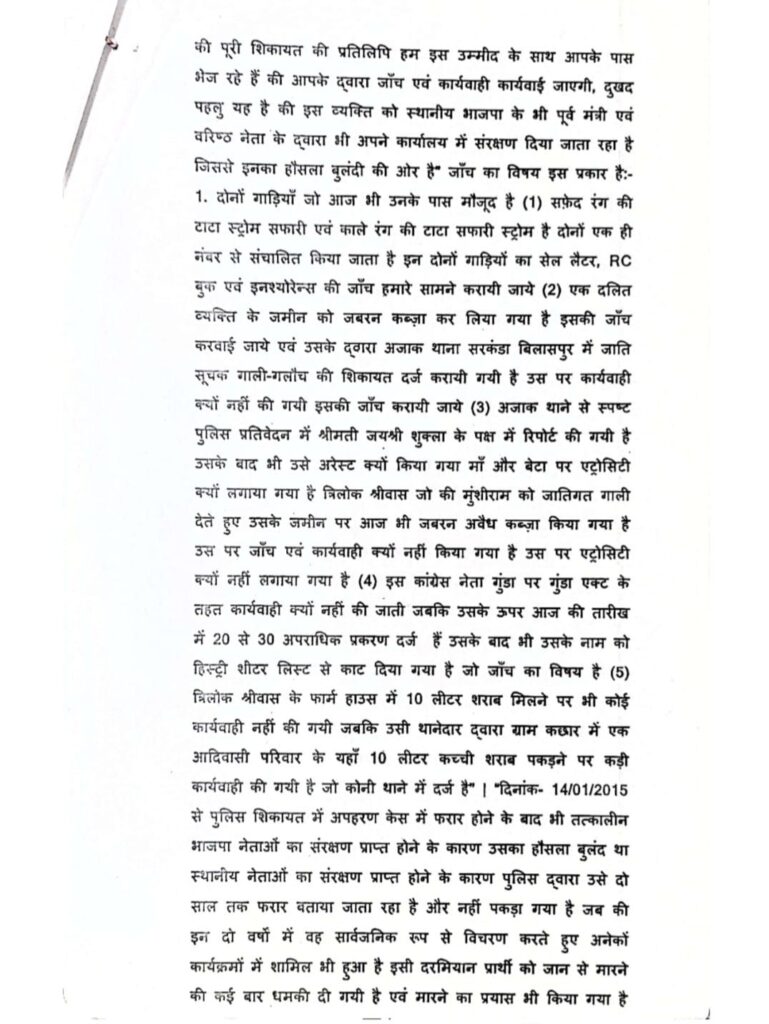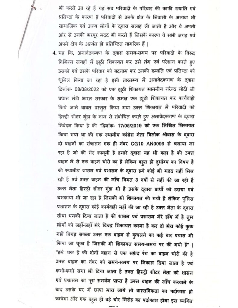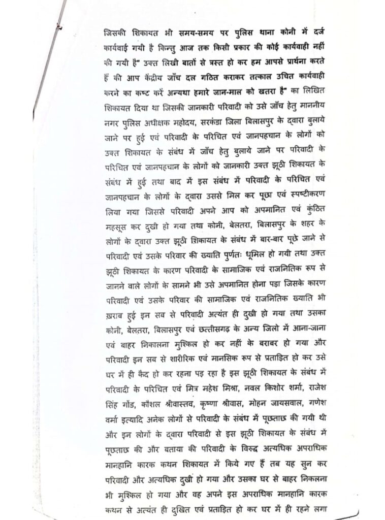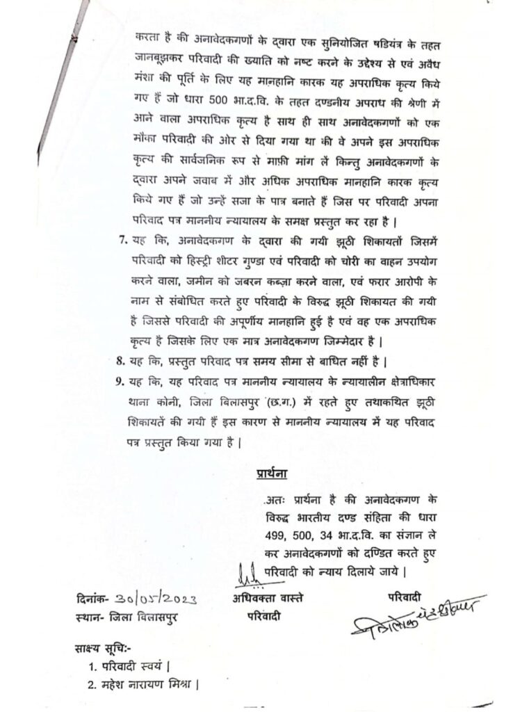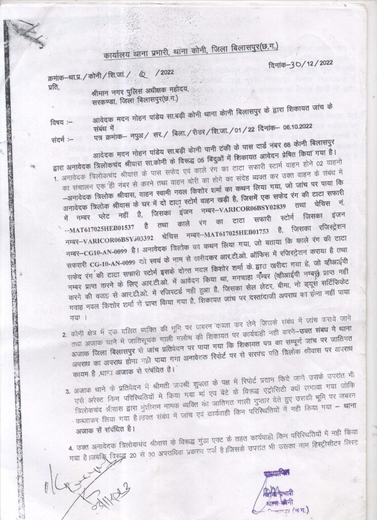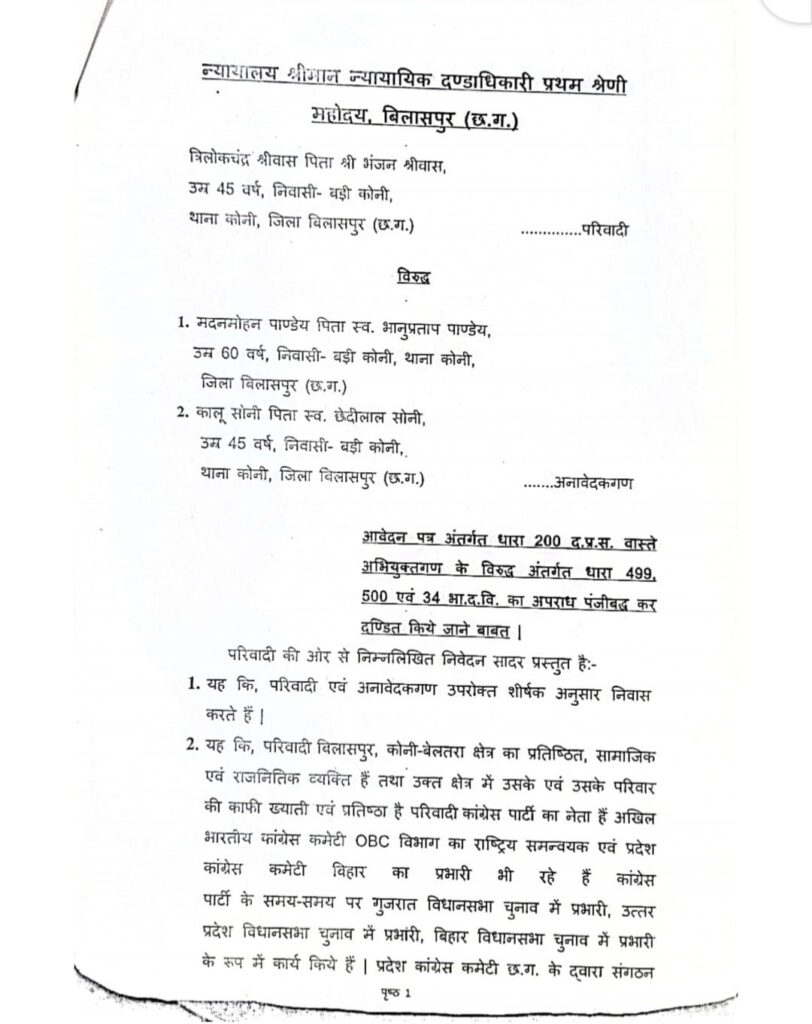 सांच को आंच नहीं, अफवाह फैलाकर छवि धूमिल करने का करते रहे हैं, साजिश- त्रिलोक चंद्र श्रीवास,, बिलासपुर जिले के लोकप्रिय जननेता श्री त्रिलोक चंद्र श्रीवास राष्ट्रीय समन्वयक – अखिल भारतीय कांग्रेस कमेटी ने प्रेस विज्ञप्ति जारी करते हुए कहा कि सiच को कभी आंच नहीं आ सकता मेरे जनहित और समाज सेवी कार्यो से जिन लोगों को तकलीफ होती है वह लोग पिछले 15- 20 वर्षों से लगातार मेरे और मेरे परिवार समर्थकों के विरुद्ध झूठी शिकायत कर छवि खराब करने की कोशिश करते हैं, परंतु कभी भी सत्य परेशान हो सकता है पराजित नहीं,, आज तक कभी वह उनके बाल बांका नहीं कर पाए हैं और ना ही वह उनके परिवार ने कभी कोई गलत कार्य किया है, अभी वर्तमान में आदतन शिकायत करता मदन मोहन पांडे निवासी बड़ी कोनी और कालू सोनी जो विगत 15 वर्षों से त्रिलोक श्रीवास उनके परिवार की छवि खराब करने के लिए दर्जनों झूठी शिकायत करते रहते हैं,, और जांच में हमेशा इनके शिकायतों को झूठा पाया गया है, उनके द्वारा जननेता त्रिलोक श्रीवास के छवि को नुकसान पहुंचाने हेतु एक शिकायत परिवाद लगाया गया था, जिस पर माननीय न्यायालय ने मोटर वाहन अधिनियम की धारा 192 दर्ज कर जांच करने को कहा है, किसी प्रकार का अपराध या BNS का कोई अपराध या कोई भी जुर्म दर्ज करने के आदेश नहीं दिए हैं, विदित हो कि मोटर वाहन अधिनियम 1988 की धारा 192 के तहत बिना पंजीयन के गाड़ी चलाने पर 2000 से लेकर रुपए 5000 का अर्थ दंड होता है, पुलिस से इस पर जांच करने को कहा गया है कांग्रेस नेता से त्रिलोक श्रीवास ने कहा कि अभी कोर्ट के आदेश से जांच होगा जांच में कोर्ट में वह अपने पक्ष रखेंगे उनके द्वारा किसी प्रकार का कोई गलत कार्य नहीं किया गया है, तत्पश्चात कोर्ट निर्णय लेगा कि दोषी कौन है, लेकिन उनकी छवि को खराब करने के लिए सोशल मीडिया में जिस प्रकार से अफवाह और दुष्प्रचार किया जा रहा है यह विघ्नसंतोषियों का हमेशा से कार्य रहा है, और इससे उनके हौसले ना कभी कम हुई ना उनका जनआधार कम हुआ अपितु उनकी लोकप्रियता और जन आधार में हमेशा बढ़ोतरी हुई है, क्योंकि वह जनता के लिए, और सच्चाई के लिए हमेशा लड़ते रहे हैं,, श्री त्रिलोक चंद्र श्रीवास ने बताया कि मदन मोहन पांडे के द्वारा सन 2022 में भी पुलिस अधीक्षक और माननीय प्रधानमंत्री कार्यालय को झूठी शिकायत किया गया था जिस पर पुलिस थाना कोनी एवं पुलिस अधीक्षक बिलासपुर के द्वारा दो बार जांच किया गया जिसमें मदन मोहन पांडे कालू सोनी के शिकायत को झूठा पाया गया था उन्होंने इसके समर्थन में जांच रिपोर्ट की कॉपी भी प्रस्तुत किया है, पुलिस थाना कोनी एवं पुलिस अधीक्षक बिलासपुर के द्वारा दो बार जांच किया गया जिसमें मदन मोहन पांडे कालू सोनी के शिकायत को झूठा पाया गया था उन्होंने इसके समर्थन में जांच रिपोर्