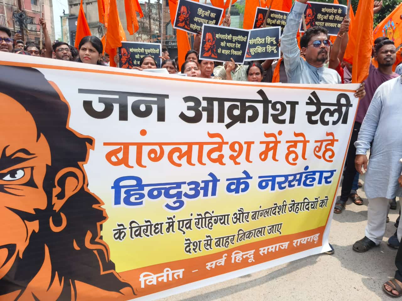 रायगढ़ / सर्व हिन्दू समाज द्वारा जन आक्रोश रैली बंगलादेश में हिन्दुओं के नरसहार में राष्ट्रीय विचार धारा के लिए राष्ट्रीय एकता अंखंडता के हमेशा संदेश देने वाले सामाजिक कार्यकर्ता श्याम गुप्ता अपने परमजीत सिंह भाटिया, अनिरुद्ध गुप्ता हेमंत डनसेना साथियो के साथ भाग लेते हुए अपना आक्रोश जाहीर करते हुए कहा मैं भारतीय पुरातन सनातन हिंदू समाज के सदस्य स्वयं हिंदू हुँ और हिंदू समाज हमेशा शांतिप्रिय रहा है पर ये भी सत्य है सनातन हिंदू धर्म सरल शांतिप्रिय होने के कारण हमेशा अलगाव वादी ताकतों के टारगेट में रहा है धर्मान्तरण हत्या बलात्कार लूट के शिकार हुआ है बंगलादेश में हिन्दुओं के नरसंहार जो हों रहा है सबसे ज्यादा वहां हिंदू महिला बेटियों को के दुखद घटना घट रहा है अपनी रक्षा के लिए रात रात भर सो नहीं रही है ये अलगाव वादी विचार धारा नफरत की बीज बोने वाले ये रोहंगिया मुसलमान भारत देश में बड़ी संख्या में आ गए है उनके लागातार फर्जी आधार कार्ड बन गए है मिली भगत में इनकी एक जांच टीम बनाकर इन्हे भारत सरकार देश से बाहर करें वरना ये हिन्दुओं के लिए ही नहीं पुरे देश के लिए खतरा होगा जो देश में महा हिंसा बलात्कार लूट के जिम्मेदार होंगे ये रोहंगिया…. देश भारत प्रभु श्री राम श्री कृष्णा भगवान बुद्ध अशांख्या संत महापुरुषों की धरती है जहाँ सिर्फ अमन शांति की बात होती है पर देश में लागातार धर्म जातिवाद के जहर घोला जा रहा ये विषय पर अंकुश लगनी चाहिए l