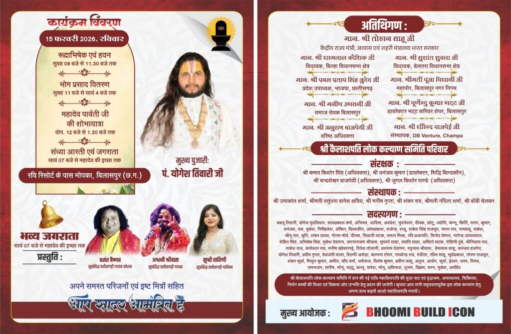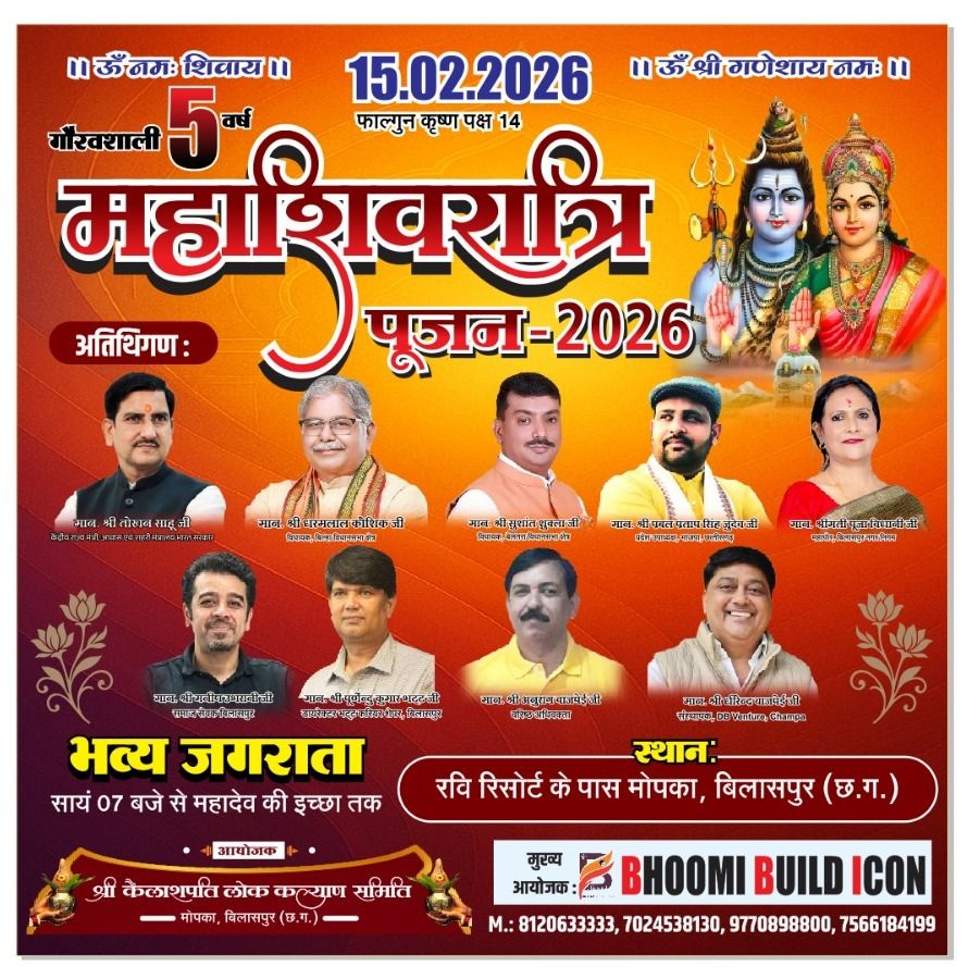 बिलासपुर…..महाशिवरात्रि के पावन अवसर पर श्री कैलाशपति लोक कल्याण समिति, मोपका द्वारा कल 15 फरवरी 2026, रविवार को महाशिवरात्रि पूजन-2026 का भव्य आयोजन किया जा रहा है। कार्यक्रम स्थल रवि रिसोर्ट के पास, मोपका, बिलासपुर (छत्तीसगढ़) में रहेगा। आयोजन समिति ने श्रद्धालुओं से अधिक से अधिक संख्या में उपस्थित होकर धर्मलाभ लेने की अपील की है।