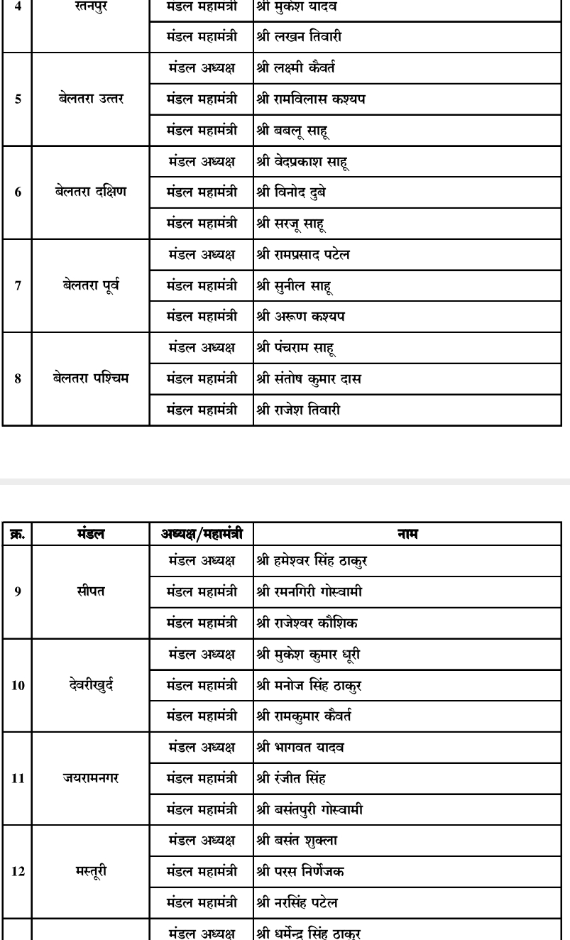 घोषणा के तहत देवरी खुर्द मंडल से मुकेश धुरी को किसान मोर्चा का मंडल अध्यक्ष नियुक्त किया गया है। वहीं मनोज सिंह ठाकुर को मंडल महामंत्री तथा राजकुमार को भी मंडल महामंत्री की जिम्मेदारी सौंपी गई है। इसके अतिरिक्त जयरामनगर मंडल से भागवत यादव और मस्तूरी मंडल से बसंत शुक्ला को किसान मोर्चा का मंडल अध्यक्ष बनाया गया है।