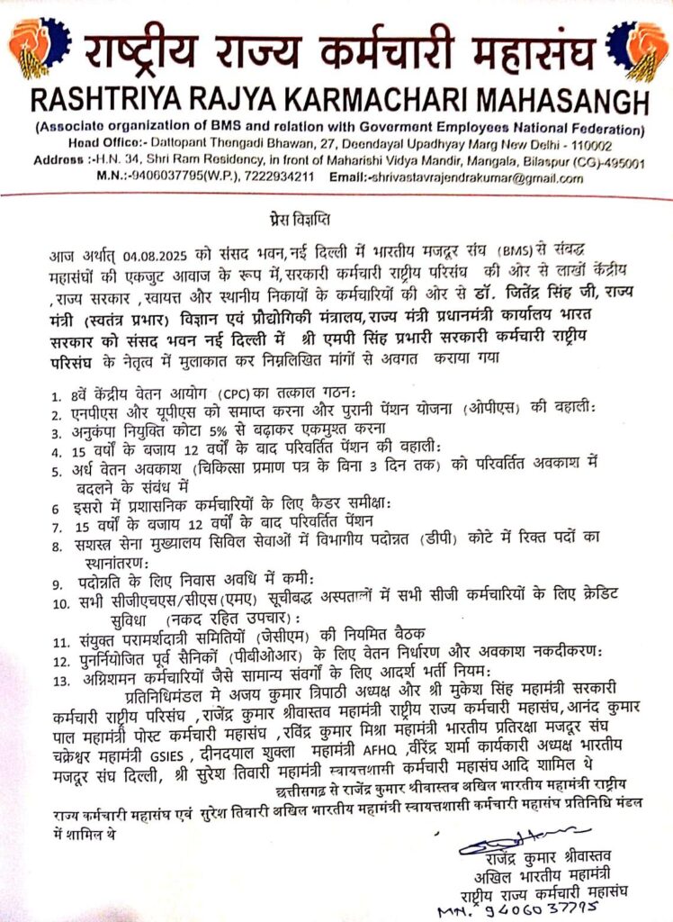 04.08.2025  संसद भवन, नई दिल्ली में भारतीय मजदूर संघ (BMS) से संबद्ध महासंघों की एकजुट आवाज के रूप में, सरकारी कर्मचारी राष्ट्रीय परिसंघ की ओर से लाखों केंद्रीय , राज्य सरकार , स्वायत्त और स्थानीय निकायों के कर्मचारियों की ओर से डॉ. जितेंद्र सिंह जी, राज्य मंत्री (स्वतंत्र प्रभार) विज्ञान एवं प्रौद्योगिकी मंत्रालय, राज्य मंत्री प्रधानमंत्री कार्यालय।