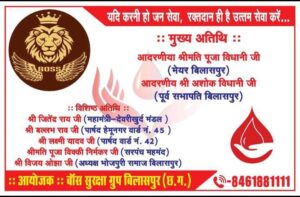 30 जुलाई को बॉस सुरक्षा ग्रुप बिलासपुर छत्तीसगढ़ के वार्षिकोत्सव के उपलक्ष में होंगे रक्तदान शिविर ,सांस्कृतिक कार्यक्रम