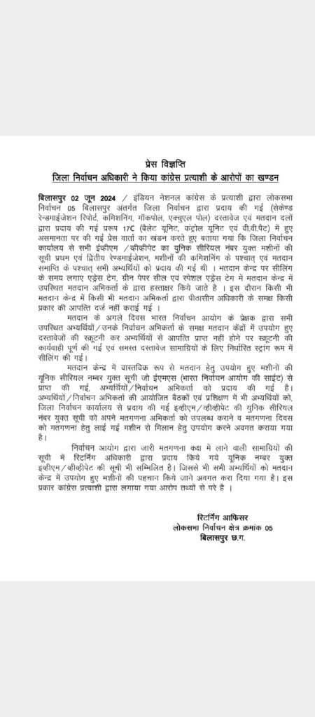 इंडियन नेशनल कांग्रेस के प्रत्याशी द्वारा लोकसभा निर्वाचन 05 बिलासपुर अंतर्गत जिला निर्वाचन द्वारा प्रदाय की गई (सेकेण्ड रेन्डमाईजेशन रिपोर्ट, कमिशनिंग, मॉकपोल, एक्चुएल पोल) दस्तावेज एवं मतदान दलों द्वारा प्रदाय की गई प्ररूप 17C (बैलेट यूनिट, कंट्रोल यूनिट एवं वी.वी.पैट) में हुए असमानता पर प्रेस वार्ता के जरिए लगाए गए आरोपों का कलेक्टर एवं जिला निर्वाचन अधिकारी ने खंडन किया है। उन्होंने कहा कि जिला निर्वाचन कार्यालय से सभी ईव्हीएम / व्हीव्हीपेट का युनिक सीरियल नंबर युक्त मशीनों की सूची प्रथम एवं द्वितीय रेण्डमाईजेशन, मशीनों की कमिशनिंग के पश्चात् एवं मतदान समाप्ति के पश्चात् सभी अभ्यर्थियों को प्रदाय की गई थी। मतदान केन्द्र पर सीलिंग के समय लगाए एड्रेस टेग, ग्रीन पेपर सील एवं स्पेशल एड्रेस टेग में मतदान केन्द्र में उपस्थित मतदान अभिकर्ता के द्वारा हस्ताक्षर किये जाते है। इस दौरान किसी भी मतदान केन्द्र में किसी भी मतदान अभिकर्ता द्वारा पीठासीन अधिकारी के समक्ष किसी प्रकार की आपत्ति दर्ज नहीं कराई गई ।