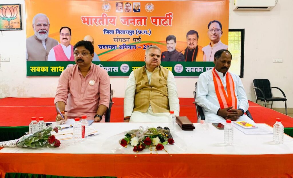 जिला भाजपा कार्यालय बिलासपुर में क्षेत्रीय संगठन मंत्री अजय जामवाल और प्रदेश संगठन मंत्री पवन साय ने भाजपा की सदस्यता अभियान को लेकर संभाग स्तरीय समीक्षा बैठक ली बैठक में संभाग स्तरीय अनुराग देव सिंह की उपस्थिति में जिलाध्यक्ष,जिला संयोजक और जिले के सदस्यता प्रभारियों से जिलेवार सदस्यता अभियान की जानकारी ली गई बैठक सदस्यता को लेकर सभी जिलाध्यक्षों ने वृत्त प्रस्तुत किए  क्षेत्रीय संगठन मंत्री अजय जामवाल ने कहा कि सदस्यता अभियान की प्राथमिकता को हमे गंभीरता से लेना होगा इसके बल पर ही हम देश की पहली बड़ी पार्टी बने हुए हैं पार्टी ने इसे सदस्यता महापर्व का नाम दिया है अतः अन्य त्योहारों की भांति हम इस संगठन महापर्व में भी उत्साह के साथ भाग लेंगे पूरे छत्तीसगढ़ में 60 लाख सदस्य बनाने का लक्ष्य निर्धारित किए गए हैं इसे पूरा करने सुनियोजित ढंग से कार्यवाही जानी चाहिए यहां पर अपने संगठन कौशल का परिचय देना होगा प्रतिदिन के हिसाब से सदस्यता का एक लक्ष्य तय कर उसकी मॉनिटरिंग की जाए हारे हुए बूथों को चिन्हांकित कर ऐसे बूथों में श्रेष्ठ प्रबंधन कुशल कार्यक्रताओं को जिम्मेदारी दे और जीते हुए बूथों में प्राप्त मतों का 75% सदस्य बनाए जाने की योजना बनाई गई है ज्यादा से ज्यादा सदस्य बने अतः सामाजिक प्रमुखों, स्वसहायता समूहों,अधिवक्ता संगठन,डॉक्टर संगठन,युवा टीम उद्योगपतियों से संपर्क स्थापित करे छोटे छोटे लाभार्थी सम्मेलन आयोजित करें
