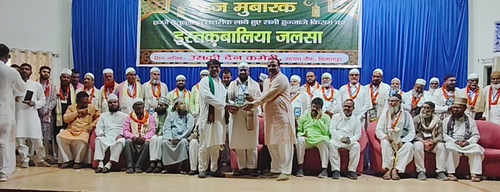 बिलासपुर। हर साल की तरह इस बार भी उसकी देन कमेटी बिलासपुर के द्वारा हज यात्रा से लौटे 66 हाजी एवं हज्जनों का सम्मान किया गया। लखीराम ऑडिटोरियम में उसकी देन कमेटी के सम्मान समारोह कार्यक्रम में मुख्य अतिथि के रूप में कोटा विधायक अटल श्रीवास्तव शामिल हुए। कार्यक्रम की अध्यक्षता विधायक दिलीप लहरिया ने की। अति विशिष्ट अतिथि के रूप में छत्तीसगढ़ हज कमेटी के अध्यक्ष हाजी मो इमरान , तथा विशिष्ट अतिथि के रूप में जहीर आगा , इमाम आरिफ अंजुम कारी शब्बीर नूरी, मौलाना मजहर, सदर यूसुफ हुसैन बंटी, अरपा विकास प्राधिकरण के पूर्व उपाध्यक्ष अभय नारायण राय के आतिथ्य में हाजी एवं हज्जनों को पुष्प हार साल तथा स्मृति चिन्ह से सम्मानित किया गया। समारोह के मुख्य अतिथि विधायक कोटा अटल श्रीवास्तव ने प्रदेश से आए हाजी हज्जनों को सम्मानित करते हुए कहा है कि हमारा हिंदुस्तान एक गुलदस्ता की तरहहै। जहां सभी सभी धर्म के लोग कौमी एकता के रूप में अपनी आस्था के अनुसार मिलजुल कर सभी धर्म का सम्मान करते हैं। आज के इस समारोह में हज से लौटे ताजा तरीन चेहरे को देखकर लगता है कि हम हम उस पवित्र स्थान का दीदार कर रहे हैं। विधायक दिलीप लहरिया ने भी हाजियों को सम्मानित करते हुए अपने अंदाज में कहा कि शिक्षा के क्षेत्र में मुस्लिम समाज के लोग पहले से बेहतर नजर आ रहे हैं। उन्होंने सामाजिक एकता और संगठन पर जोड़ देते हुए कहा कि कि उसकी देन कमेटी के द्वारा समाज सेवा के साथ-साथ हज से लौटे हाजियों का सम्मान करना अनुकरणीय पहल है। उन्होंने उसकी देन कमेटी के सभी सदस्यों की तारीफ भी की। और हाजियों से आशीर्वाद मांगते हुए प्रदेश में अमन और शांति की कामना की। छत्तीसगढ़ हज कमेटी के अध्यक्ष हाजी मोहम्मद इमरान ने कहा कि आजकल वक्फ बोर्ड की संपत्तियों में 70 -80 फ़ीसदी मुस्लिम समाज के लोगों का कब्जा है और और ना के मुताबिक शुल्क देकर वक्फ की संपत्ति पर कब्जा करके बैठे हैं ,जबकि दिनचर्या में रोज 100 -200 रुपए का पान गुटका में खर्च करते हैं लेकिन सही ढंग से संपत्तियों का शुल्क अदा नहीं करते यह चिंता का विषय है।