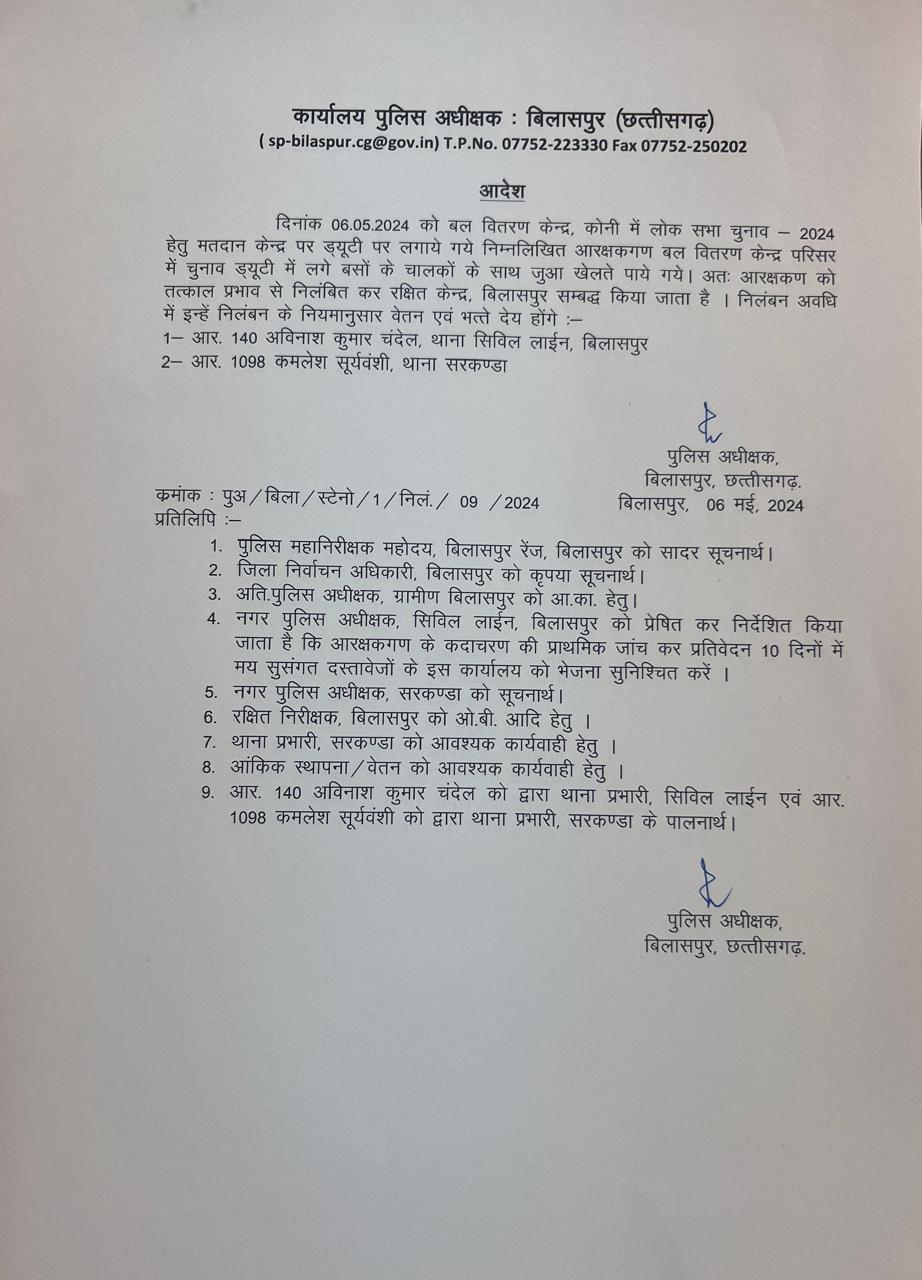 आरक्षक अविनाश कुमार चंदेल (आर. क्र 140) की वर्तमान पदस्थापना सिविल लाईन थाना बिलासपुर एवं आरक्षक कमलेश सूर्यवंशी (आर क्रमांक 1098) की पदस्थापना थाना सरकण्डा में है। गौरतलब है कि दोनों आरक्षकों की ड्यूटी मतदान दलों के साथ सुरक्षा बलों की ड्यूटी लगाने के कार्य में लगाई गई थी। दोनों आरक्षक चुनाव कार्य के लिए अधिग्रहित किये गये वाहनों के चालकों के साथ जुआ खेलते पाये गये। एसपी ने सिविल लाईन थाना के नगर पुलिस अधीक्षक को आरक्षकों के कदाचरण की जांच कर 10 दिनों में प्रमाण सहित प्रतिवेदन प्रस्तुत करने के निर्देश दिए हैं।