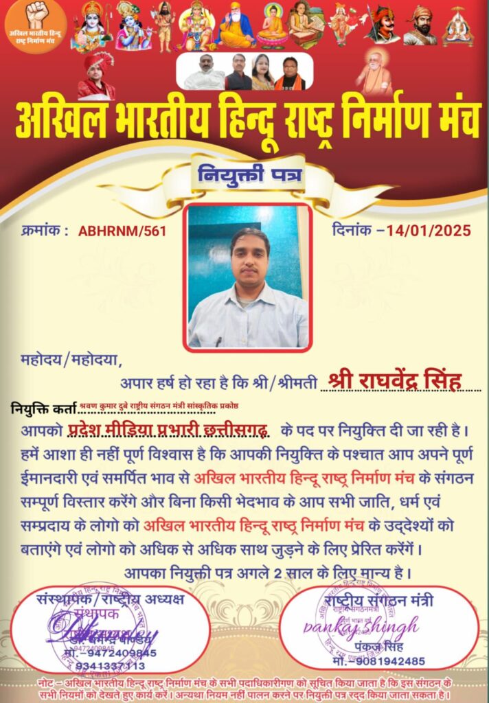 (राष्ट्रीय महासचिव सैन्य प्रकोष्ठ) संस्था द्वारा नियुक्ति पत्र जारी कर के करतल ध्वनि में घोषणा किया गया। इसके साथ ही छत्तीसगढ़ राज्य के साथ संपूर्ण भारत में अखिल भारतीय हिंदू राष्ट्र निर्माण मंच अपने संवैधानिक कार्यों के साथ समाज में बढ़ते हुए विधर्मी, असामाजिक तत्व के ऊपर संवैधानिक रूप से रोक लगाने का कार्य भी करेगी जिससे गौ माता गौ रक्षा प्रकोष्ठ ,महिला सुरक्षा हेतु महिला प्रकोष्ठ, मीडिया कर्मियों के सुरक्षा हेतु मीडिया प्रकोष्ठ ,भूतपूर्व सैनिक के कल्याण हेतु सैनिक प्रकोष्ठ, संवैधानिक रूप से छत्तीसगढ़ राज्य के साथ संपूर्ण भारत और बेहतर बनाने के लिए सभी हिंदू आम जनमानस के जीवन को मजबूती हेतु मुख्य धारा प्रवाह से जोड़ने की बात कही। राष्ट्रीय संगठन मंत्री पंडित श्रवण दुबे अभी हाल ही में 5 माह के प्रवास के दौरान उत्तर प्रदेश में हुए कई आश्रमों ,धर्मस्थल के जीर्णोद्वार का कार्य भी संवैधानिक रूप से शुरूआत किया जिसके कारण सनातन धर्म की मजबूती का रास्ता प्रशस्त हुआ। जल्द ही संस्था अपने पूरे कोर कमेटी की मीटिंग नवनीत पदाधिकारी द्वारा प्रत्येक माह में करेगी जिसमें गुरुकुल, गौशाला, वृद्धाश्रम , कमजोर वर्ग के लोगों को सामाजिक न्याय,बेरोजगार युवाओं को प्राइवेट सेक्टर में रोजगार , के साथ आम जनमानस को सरकार द्वारा नियोजित शिक्षा स्वास्थ्य के लिए भी जागरूक करेगी ताकि हिंदू राष्ट्र को लेकर छत्तीसगढ़ के साथ अन्य प्रदेशों में ब्लॉक स्तर पर कार्यक्रम हो एवम पूरे भारत में ग्राम पंचायत से लेकर जिला स्तर तक अपने कार्यकर्ता नियुक्त हो सके। साथ ही धर्म संस्कृति सनातन का दोहन रोकने का हर संभव प्रयास करेगी व हिंदू राष्ट्र निर्माण को लेकर अपनी आवाज प्रत्येक जिले प्रत्येक ग्राम प्रत्येक पंचायत स्तर तक आवाज उठाएगी। सभी हिंदू समाज को मजबूत करने हेतु भारत सरकार की योजनाओं का प्रचार प्रसार करते हुए अखंड हिंदू राष्ट्र की आवाज को मजबूत करेगी। कार्यक्रम में पंडित श्रवण दुबे समुद्र शास्त्री ने अखिल भारतीय हिंदू राष्ट्र निर्माण मंच बिलासपुर छत्तीसगढ़ के नव नियुक्त पदाधिकारीयो की घोषणा के साथ बौद्धिक योगी गोष्ठी कार्यक्रम में सभी हिन्दुसमाज को मुख्य धारा प्रवाह से जोड़ने का आवाहन किया । नवनियुक्त पदाधिकारीयो में कंचन देवी प्रदेश अध्यक्ष(महिला प्रकोष्ठ) छत्तीसगढ़ ,राघवेंद्र सिंह मीडिया प्रभारी छत्तीसगढ़, ने भी छत्तीसगढ़ राज्य की कार्यकारिणी को मजबूत करते हुए