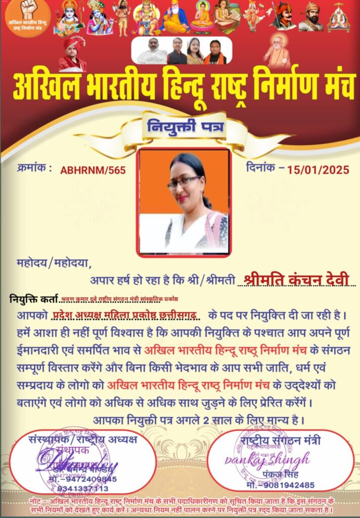 अखिल भारतीय हिंदू राष्ट्र निर्माण मंच द्वारा बिलासपुर छत्तीसगढ़ मे अन्य पदाधिकारियों के साथ कंचन देवी प्रदेश अध्यक्ष( छ.ग.) कि हुई नियुक्ति