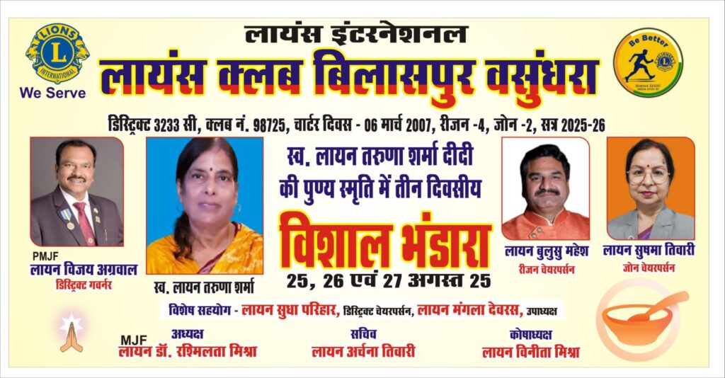 लायंस क्लब वसुंधरा ने डिस्ट्रिक्ट प्रोजेक्ट हंगर के अंतर्गत तीन दिन लगातार भोजन वितरण का कार्यक्रम रखा यह कार्यक्रम पुराना बस स्टैंड हनुमान मंदिर के पास राम रसोई के साथ में मिलकर रखा गया वसुंधरा क्लब ने क्लब फाउंडर लायन तरुणा शर्मा जी की स्मृति में तीन दिवसीय दिनांक 25 ,26,27,को हंगर का प्रोग्राम रखा गया जिसमें प्रथम उपाध्यक्ष मंगला देवरस एवं डिस्ट्रिक्ट चेयरपर्सन सुधा परिहार का सहयोग रहा शुरू दिन विशेष सहयोग में सुधा परिहार जीने अपना योगदान दिया एवं तीज एवं गणेश चतुर्थी के उपलक्ष में विशेष सहयोग में मंगला देवरस दीदी ने अपना योगदान दिया तीन दिवसीय भोजन वितरण के कार्यक्रम में अध्यक्ष रश्मि लता मिश्रा जी, सचिव अर्चना तिवारी, कोषाध्यक्ष विनीता मिश्रा, एमजेएफ संजना मिश्रा , डिस्ट्रिक्ट चेयरपर्सन डॉक्टर शोभा त्रिपाठी जी, उपाध्यक्ष हंसा सेलारका,गायत्री कश्यप, मंगला देवरस, सुधा परिहार, सीता तिवारी ,सावित्री जायसवाल, ने अपनी उपस्थिति देकर कार्यक्रम को सफल बनाया