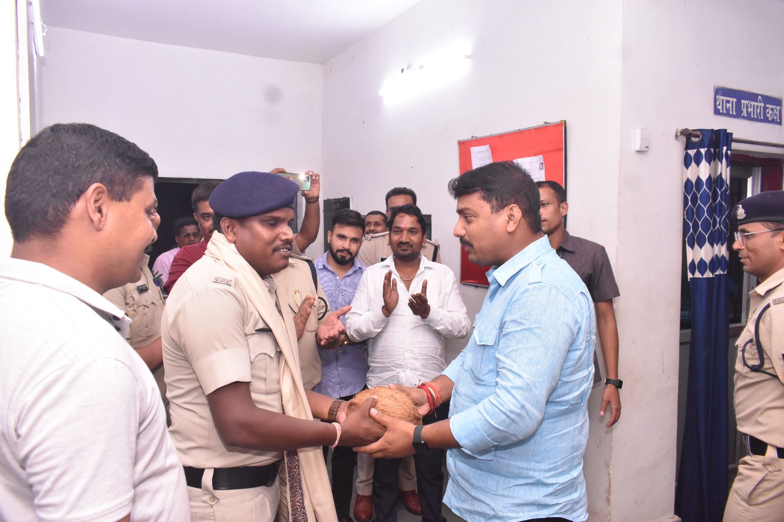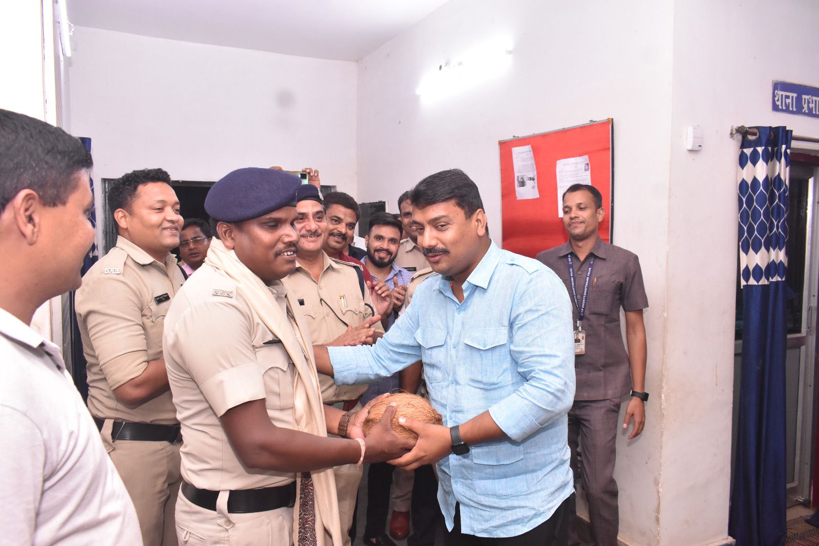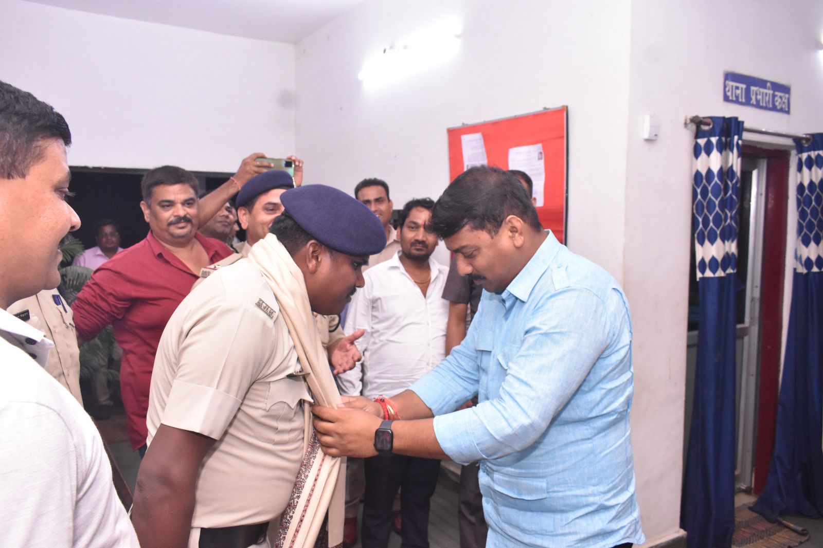 बिलासपुर- बेलतरा विधानसभा के बगदेवा गांव में आए बाढ़ में खुद पानी में जाकर लोगों को सुरक्षित निकालने वाले रतनपुर थाना के आरक्षक बसंत दास मानिकपुरी का बेलतरा विधायक सुशांत शुक्ला ने थाने जाकर किया सम्मान। आरक्षक की बहादुरी और कर्तव्यनिष्ठा के प्रति आभार व्यक्त करते हुए विधायक सुशांत ने आरक्षक बंसत को शाल और नारियल भेंटकर सम्मान किया। इस अवसर पर विधायक सुशांत शुक्ला ने आरक्षक और पूरी टीम की प्रशंसा करते हुए कहा की आप लोगों की सजगता और त्वरित कार्रवाई से नागरिकों को राहत मिली और वें सुरक्षित है।