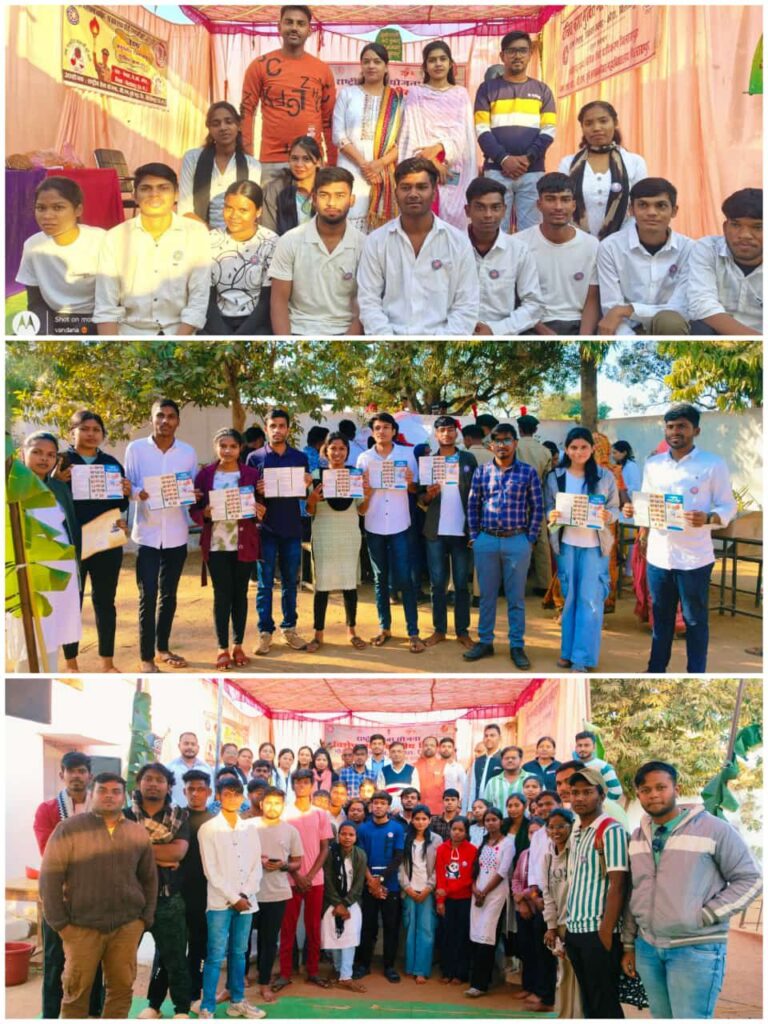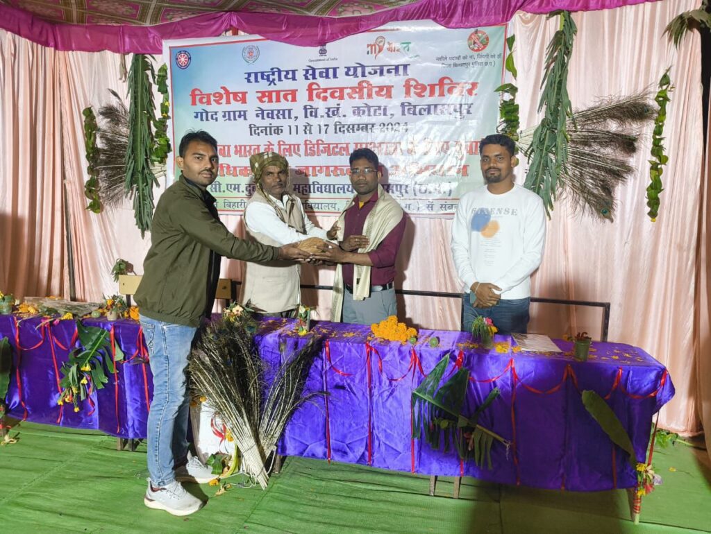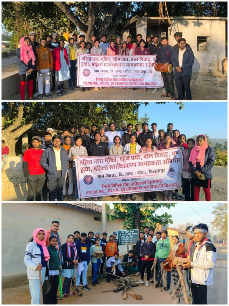 राष्ट्रीय सेवा योजना सी एम दुबे महाविद्यालय बिलासपुर के गोद ग्राम नेवसा में अनेक कार्यों का आयोजन मंदिर निर्माण, विधिक साक्षरता, अभियान स्वच्छता जोरो पर अंचल के प्रतिष्ठित कम दुबे महाविद्यालय के राष्ट्रीय सेवा योजना का साथ दिवसीय विशेष शिविर का आयोजन दिनांक 11 दिसंबर से 17 दिसंबर तक चल रहा है इस आयोजन में एनएसएस के स्वयंसेवकों ने अनेक कार्य कर रहे हैं यह भारत सरकार युवा खेल मंत्रालय द्वारा संचालित है यह शिविर में मेरा युवा भारत के लिए युवा डिजिटल साक्षरता के लिए युवा की थीम पर कार्य चल रहा है साथ ही विधिक सेवा जागरूकता भी चलाया जा रहा है जिसमें हाईटेक बस के माध्यम से गांव-गांव जाकर बैगा आदिवासी समुदाय के बीच नशा मुक्ति घरेलू हिंसा लैंगिक समानता के विरुद्ध कार्यक्रम जागरूकता अभियान चलाया जा रहा है यह कार्यक्रम राज्य विधिक सेवा प्राधिकरण के सदस्य सचिव सम्माननीय अशोक कुमार लाल और जिला विधिक सेवा प्राधिकरण के सचिव सम्माननीय राकेश सिंह सोरी के साथ मिलकर विधिक जागरूकता का कार्यक्रम एनएसएस के नेतृत्व में कार्य को पूरा किया जा रहा है । द्वितीय दिवस के उपरांत में व्यक्तित्व विकास और राष्ट्र निर्माण के लिए युवा का परिचय देते हुए डॉ एस एल निराला प्राचार्य शासकीय जेपी वर्मा कॉलेज बिलासपुर साथ ही डॉ डी के महिलांगे उपस्थित रहे डॉ निराला ने बताया नस व्यक्तित्व के विकास एवं सामुदायिक भावना को प्रोत्साहित करने में महत्वपूर्ण भूमिका निभाता है युवाओं में अनुशासन एवं देश तथा समाज के प्रति समर्पण भाव जागृत करता है स्वयंसेवकों का हौसला बढ़ाते हुए कहा कि लहरों से डर कर नौका पार नहीं होती कोशिश करने वालों की हार नहीं होती और भी कई कविता के माध्यम से युवाओं को जागरूक किया साथ ही हमारा शिविर का भ्रमण किया और हमारे कार्यों को देखकर हमारे महाविद्यालय इकाई का भूरी भूरी प्रशंसा और बधाई दी । तृतीय दिवस के उपरांत हमारे कार्यक्रम में विधिक सेवा जागरूकता की रैलियां का आयोजन किया गांव-गांव जाकर गली-गली मोहल्ले में स्वच्छता का कार्यक्रम किया गया जिससे कि गांव में रहने वाले लोगों को न्याय व्यवस्था “जात पात का मीठे निशान पढ़ा लिखा मजदूर किसान” , “प्रकृति के दुश्मन तीन पाउच पनी पाली थीम” इन सब का नारा देते हुए जागरूक किया गया साथ ही हमारे उन्नत कृषि ग्रामीण सेवा के बारे में श्री के के बंजारे ग्रामीण कृषि विस्तार अधिकारी ने बताया कि उन्नत कृषि मोटा अनाज के बारे में बताया ज्वार ,बाजरा, रागी, कुटकी अधिक महत्वपूर्ण है और लाभदायक है साथी इंजी. दीपक महादेवा जी ने युवाओं को प्रेरित करते हुए कहा कि हम युवा दिलो की धड़कन है परिवर्तन लेक मनाएंगे, ऐसे काम करेंगे जिसके सब मिल का पत्थर जाने गी त्रिस्काय नहीं ह