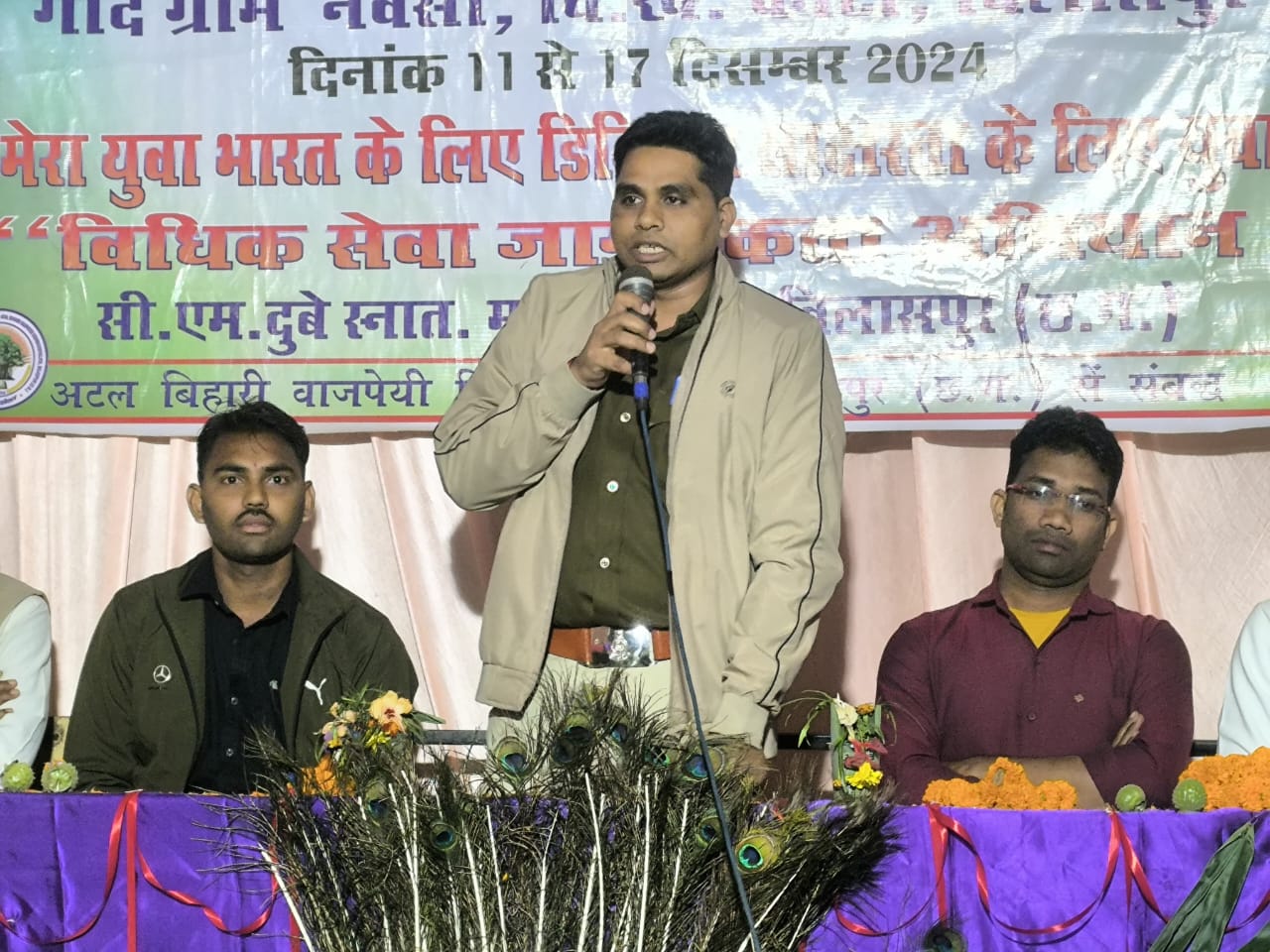 राष्ट्रीय सेवा योजना सी एम दुबे महाविद्यालय बिलासपुर के गोद ग्राम नेवसा में अनेक कार्यों का आयोजन मंदिर निर्माण, विधिक साक्षरता, अभियान स्वच्छता जोरो पर अंचल के प्रतिष्ठित कम दुबे महाविद्यालय के राष्ट्रीय सेवा योजना का साथ दिवसीय विशेष शिविर का आयोजन दिनांक 11 दिसंबर से 17 दिसंबर तक चल रहा है इस आयोजन में एनएसएस के स्वयंसेवकों ने अनेक कार्य कर रहे हैं यह भारत सरकार युवा खेल मंत्रालय द्वारा संचालित है यह शिविर में मेरा युवा भारत के लिए युवा डिजिटल साक्षरता के लिए युवा की थीम पर कार्य चल रहा है साथ ही विधिक सेवा जागरूकता भी चलाया जा रहा है जिसमें हाईटेक बस के माध्यम से गांव-गांव जाकर बैगा आदिवासी समुदाय के बीच नशा मुक्ति घरेलू हिंसा लैंगिक समानता के विरुद्ध कार्यक्रम जागरूकता अभियान चलाया जा रहा है यह कार्यक्रम राज्य विधिक सेवा प्राधिकरण के सदस्य सचिव सम्माननीय अशोक कुमार लाल और जिला विधिक सेवा प्राधिकरण के सचिव सम्माननीय राकेश सिंह सोरी के साथ मिलकर विधिक जागरूकता का कार्यक्रम एनएसएस के नेतृत्व में कार्य को पूरा किया जा रहा है । द्वितीय दिवस के उपरांत में व्यक्तित्व विकास और राष्ट्र निर्माण के लिए युवा का परिचय देते हुए डॉ एस एल निराला प्राचार्य शासकीय जेपी वर्मा कॉलेज बिलासपुर साथ ही डॉ डी के महिलांगे उपस्थित रहे डॉ निराला ने बताया नस व्यक्तित्व के विकास एवं सामुदायिक भावना को प्रोत्साहित करने में महत्वपूर्ण भूमिका निभाता है युवाओं में अनुशासन एवं देश तथा समाज के प्रति समर्पण भाव जागृत करता है स्वयंसेवकों का हौसला बढ़ाते हुए कहा कि लहरों से डर कर नौका पार नहीं होती कोशिश करने वालों की हार नहीं होती और भी कई कविता के माध्यम से युवाओं को जागरूक किया साथ ही हमारा शिविर का भ्रमण किया और हमारे कार्यों को देखकर हमारे महाविद्यालय इकाई का भूरी भूरी प्रशंसा और बधाई दी । तृतीय दिवस के उपरांत हमारे कार्यक्रम में विधिक सेवा जागरूकता की रैलियां का आयोजन किया गांव-गांव जाकर गली-गली मोहल्ले में स्वच्छता का कार्यक्रम किया गया जिससे कि गांव में रहने वाले लोगों को न्याय व्यवस्था “जात पात का मीठे निशान पढ़ा लिखा मजदूर किसान” , “प्रकृति के दुश्मन तीन पाउच पनी पाली थीम” इन सब का नारा देते हुए जागरूक किया गया साथ ही हमारे उन्नत कृषि ग्रामीण सेवा के बारे में श्री के के बंजारे ग्रामीण कृषि विस्तार अधिकारी ने बताया कि उन्नत कृषि मोटा अनाज के बारे में बताया ज्वार ,बाजरा, रागी, कुटकी अधिक महत्वपूर्ण है और लाभदायक है साथी इंजी. दीपक महादेवा जी ने युवाओं को प्रेरित करते हुए कहा कि हम युवा दिलो की धड़कन है परिवर्तन लेक मनाएंगे, ऐसे काम करेंगे जिसके सब मिल का पत्थर जाने गी त्रिस्काय नहीं ह
