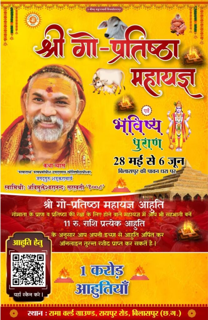 बिलासपुर। बिलासपुर के रायपुर रोड में स्थित रामा वर्ल्ड ग्राउंड में 28 मई से लेकर 6 जून तक होने जा रहे श्री गो प्रतिष्ठा महायज्ञ, भविष्य पुराण एवं 1 करोड़ आहुतियों का विशाल कार्यक्रम देश की वर्तमान परिस्थितियों को ध्यान में रखते हुए जगतगुरु शंकराचार्य स्वामी अविमुक्तेश्वरानंद सरस्वती जी महाराज ने रद्द कर दिया है। आगामी 2 महीने तक भिलाई सहित अन्य कार्यक्रमों को भी रद्द करने की घोषणा की गई है। मेरठ से अपना डिजिटल संदेश भेजकर श्री स्वामी ने कहा कि पड़ोसी देश पाकिस्तान ने आतंकवादी भेज कर देश के निर्दोष नागरिकों की जान ली है उन आतंकवादियों का नामोनिशान मिटाने के लिए भारत सरकार ने आतंकवादियों के ठिकानों पर सर्जिकल स्ट्राइक किया है। भारत का सिंदूर ऑपरेशन कार्रवाई लंबे समय तक चल सकता है इसलिए जगतगुरु शंकराचार्य अविमुक्तेश्वरानंद सरस्वती ने अपने सभी कार्यक्रमों को आगामी दो महीने तक निरस्त कर दिया है। इस मौके पर उन्होंने कहा कि सभी को इस समय देश के साथ खड़े होने की आवश्यकता है। प्रधानमंत्री,गृहमंत्री, रक्षामंत्री और तीनों सेनाअध्यक्षों द्वारा लिए जा रहे निर्णय में हम सबको उनका साथ देना है, ताकि उनका मनोबल बना रहे। उन्होंने कहा कि भारत के शत्रुओं को परास्त करना जरूरी है। इसके लिए धार्मिक अनुष्ठान कराए जाने की बात कहते हुए स्वामी ने कहा कि भारत हमेशा से अपराजेय रहा है और भारत का पराक्रम बना रहे इसलिए सभी को इस वक्त देश के साथ खड़े होने की आवश्यकता है। उन्होंने स्वयं को युद्ध के लिए और सैन्य शिविर में सेवा कार्यों के लिए भी प्रस्तुत किया हैं।