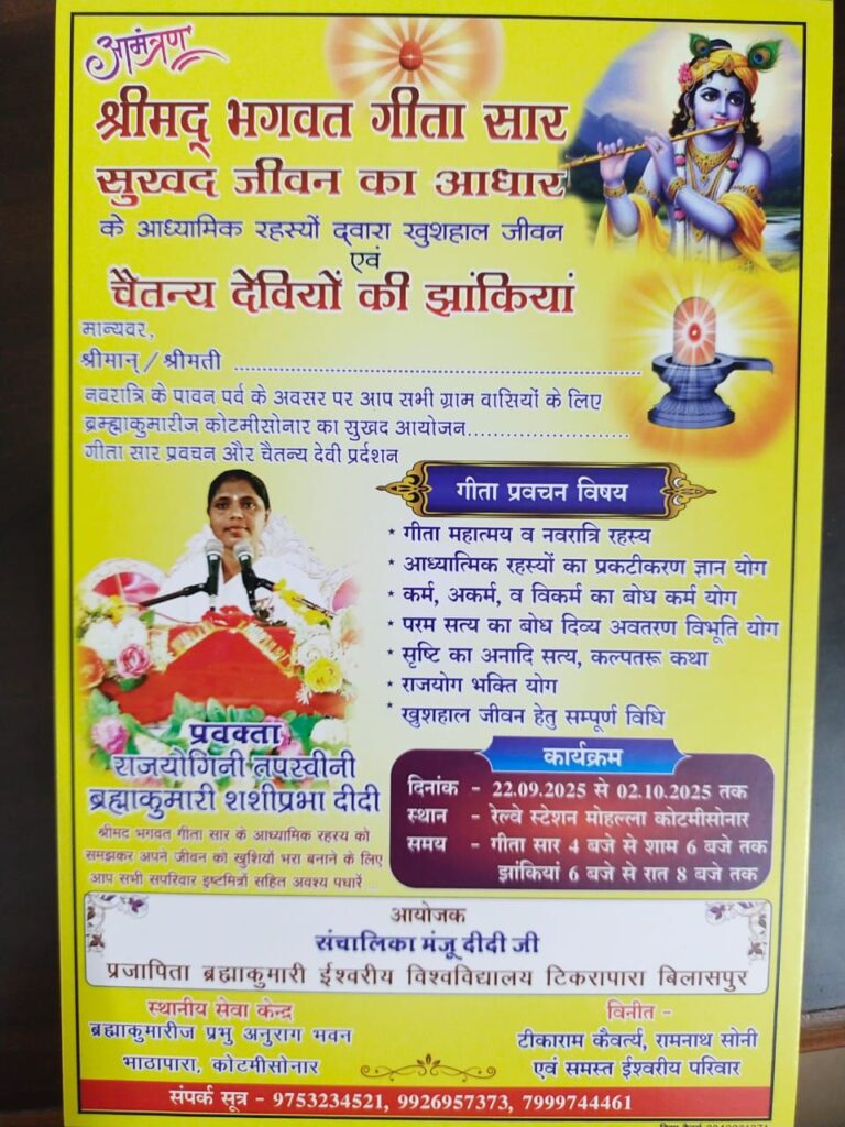कोटमीसुनार: ब्रह्माकुमारीज प्रभु अनुराग भवन कोटमीसुनार भाठापारा के द्वारा श्रीमद् भगवत गीता सार सुखद जीवन का आधार के आध्यात्मिक रहस्यों द्वारा खुशहाल जीवन कार्यक्रम के प्रथम दिन प्रवक्ता राजयोगिनी तपस्विनी ब्रह्माकुमारी शशिप्रभा दीदी ने गीतासार महात्म में कहा कि श्रीमद् भगवत गीता सर्व शास्त्रों में शिरोमणि हैl यह केवल हिंदू धर्म का शास्त्र नहीं अपितु समस्त मानव जाति का शास्त्र है इसलिए संपूर्ण गीता में कभी भी कहीं पर भी हिंदू शब्द नहीं आया है गीता ही एकमात्र शास्त्र है जिसका सबसे अधिक भाषाओं में अनुवाद हुआ है l गीता स्वयं भगवान का गाया हुआ मधुर गीत है बुद्धिमत्ता की कुंजी है कमजोर लोगों के लिए टॉनिक है इसमें अपार संपत्ति छिपी हुई है इसमें आध्यात्मिक पर खुशहाल जीवन जीने के रहस्य छिपे हुए हैं इस गीता ज्ञान यज्ञ में इन रहस्यों का उद्घाटन किया जाएगा l दीदी जी ने आगे कहा कि गीता से हिंसा की प्रेरणा ना लें l यह शास्त्र तो मन के नकारात्मक और सकारात्मक विचारों की युद्ध और उसमें सही निर्णय अर्थात धर्म के पक्ष में निर्णय लेने की शिक्षा देती है, गीता मां की तरह हमारे अंदर श्रेष्ठ संस्कारों का सृजन करती है गीता मनुष्य को खुशहाल जीवन जीने की कला सिखाती है गीता मोक्षदायिनी है इसलिए जीवन रहते ही इसका अनुसरण पठन-पाठन अध्ययन करना चाहिए lकथा वाचीका शशिप्रभा दीदी जी के पावन सानिध्य में आगामी दिनों के कार्यक्रम में आध्यात्मिक रहस्य का प्रकटीकरण, ज्ञान योग, कर्म अकर्मक विकर्म का बोध ,कर्म योग ,परम सत्य का बोध ,विराट स्वरूप दर्शन, विभूति योग ,सृष्टि का अनादि सत्य,कल्पतरु कथा राजयोग ,भक्ति योग, खुशहाल जीवन हेतु संपूर्ण विधि श्रवण कराया जाएगा l कथा समय शाम 4:00 से 6:00 तक है l इस आयोजन के निमित्त ब्रह्मकुमारिज सेवाकेंद्र से जुड़े टीकाराम कैवर्तय और रामनाथ सोनी जी हैं ।समस्त प्रभु प्रेमी भक्तों का इस पुनीत कार्यक्रम में सहभागिता उत्साह वर्धक हैl