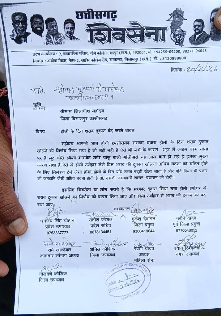 छत्तीसगढ़ शिवसेना ने सरकार से होली के दिन शराब दुकानें खोलने के कथित निर्णय को वापस लेने और त्योहार के दौरान पूर्ण रूप से बंद रखने की मांग की है।