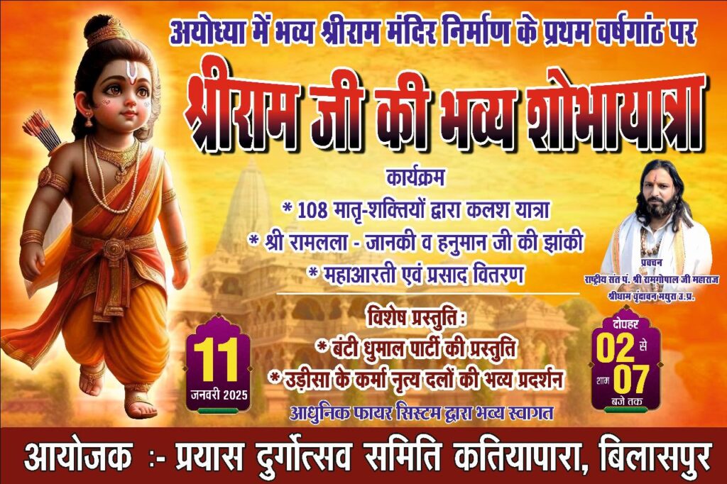 बिलासपुर-प्रयास दुर्गोत्सव समिति, कतियापारा जूना बिलासपुर में अयोध्या में भव्य श्रीराम जी की मंदिर निर्माण एवं प्रतिमा के प्रथम वर्षगांठ के शुभ अवसर पर श्रीराम जी की भव्य शोभायात्रा का आयोजन किया जा रहा है।