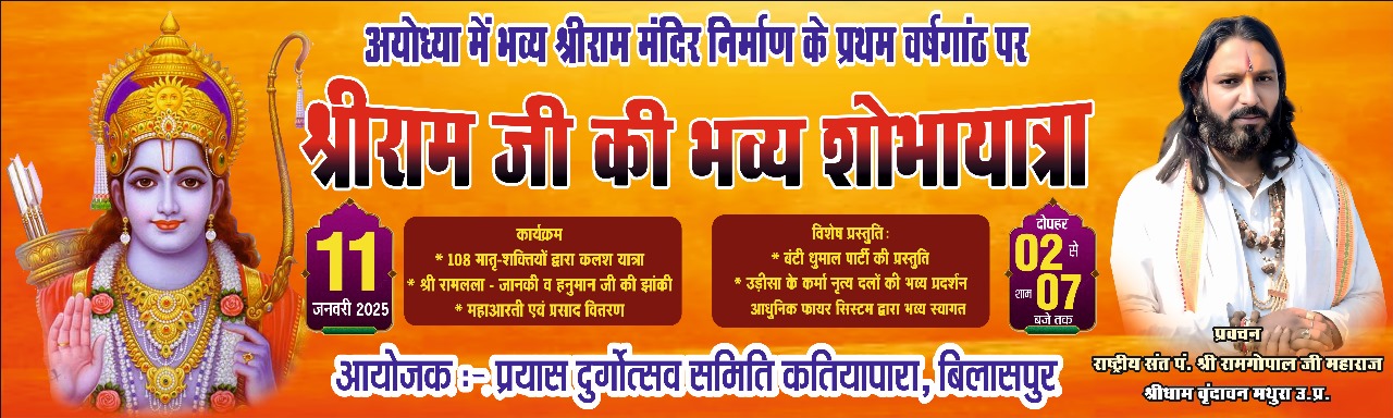बिलासपुर-प्रयास दुर्गोत्सव समिति, कतियापारा जूना बिलासपुर में अयोध्या में भव्य श्रीराम जी की मंदिर निर्माण एवं प्रतिमा के प्रथम वर्षगांठ के शुभ अवसर पर श्रीराम जी की भव्य शोभायात्रा का आयोजन किया जा रहा है।