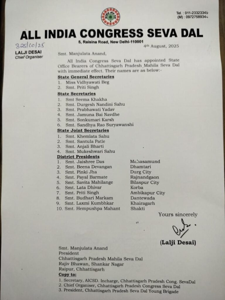 जिला कांग्रेस सेवादल बिलासपुर (छ.ग.) का महिला शहर जिला मुख्य संगठक (अध्यक्ष) नियुक्त हुईं श्रीमती सविता महिलांगे।
